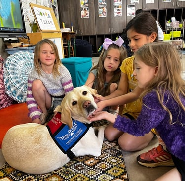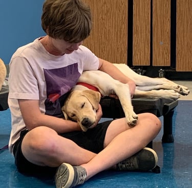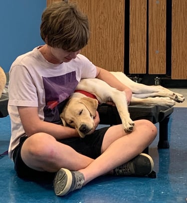 "Spruce spends most of his time with me at Wimberley High School in the Wellness Center. His intuition to go directly to students, and even staff, who are in crisis or distress is uncanny. Sometimes he notices a student tearing up before I do, and he'll simply lay at their feet, or put his head in their lap. This is a great jumping-off point for me as the counselor to start addressing what brought the student in today, and how we can help. Just in the brief few months I've had him, Spruce continues to show me new ways to engage with students who are in crisis or simply need a few minutes of support, and I can't wait to see what we'll be able to do as a team next!" - Sarah Myers Wimberley High School Wellness Center Coordinator, partner to Facility Dog Spruce