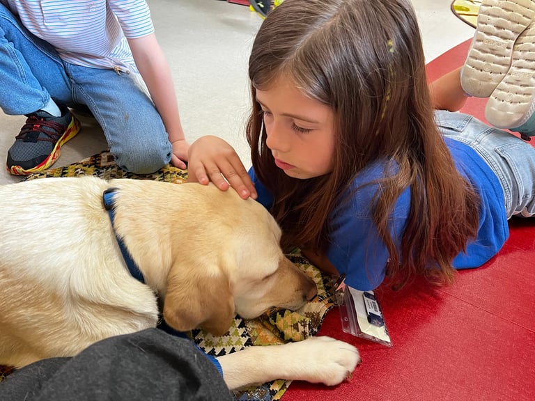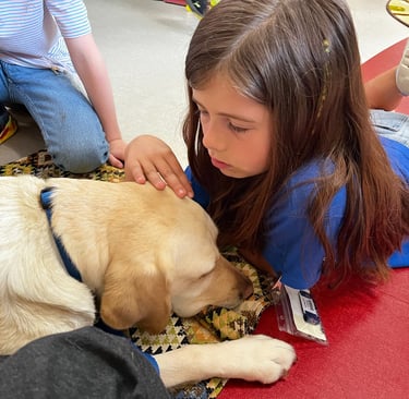 Gabby gets the opportunity to spend some one on one time with students. She has been able to help children that are feeling down, or upset about something. They feel comfortable sharing their emotions when they are sitting with Gabby and calmly petting her. Her presence in a reading circle has motivated children to read outloud and with confidence. Gabby has helped children feel important as they are given the chance to help hold the leash when walking down the hallway~or giving her commands that she responds to! EMPOWERING for a little one!